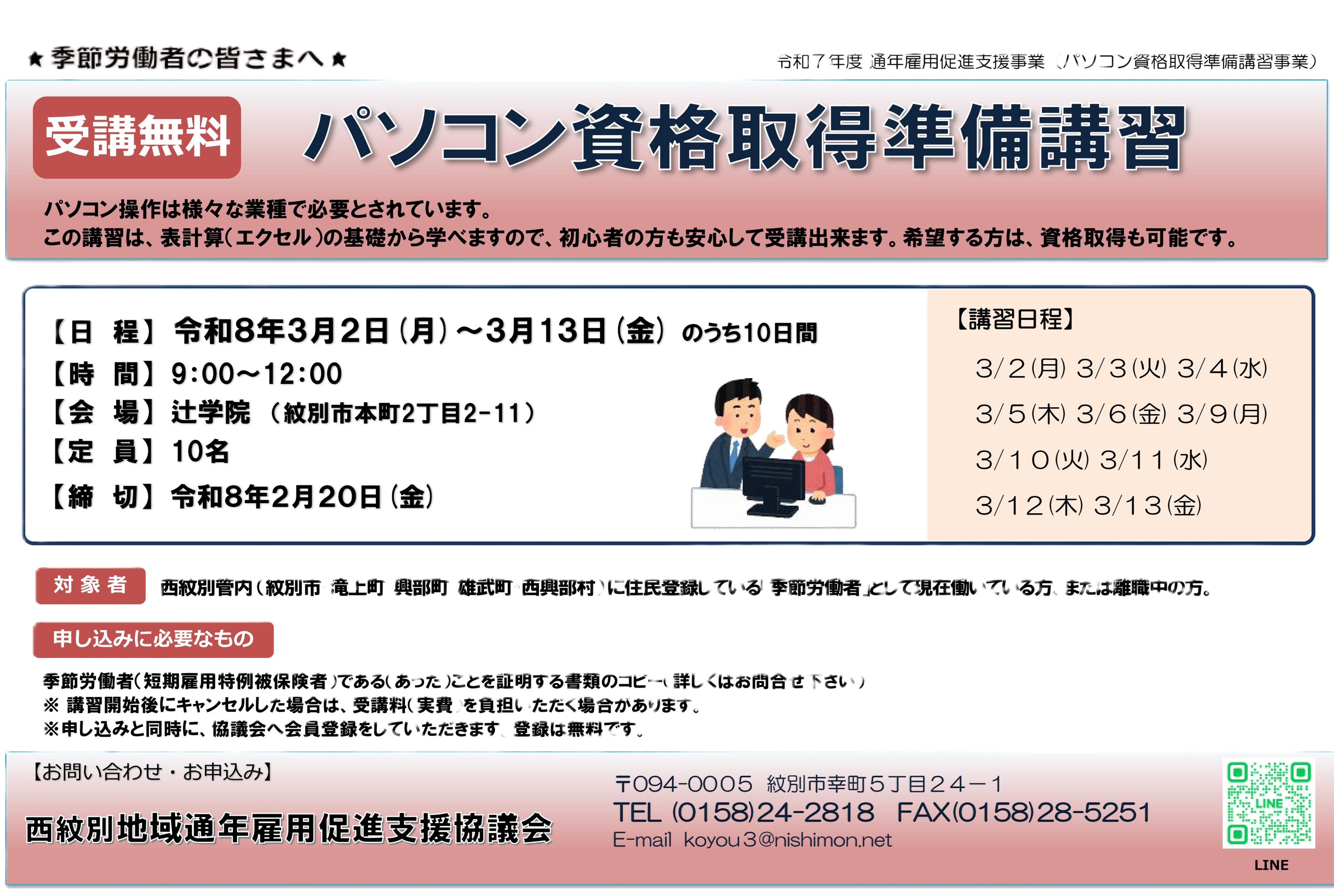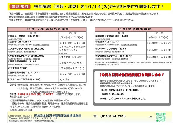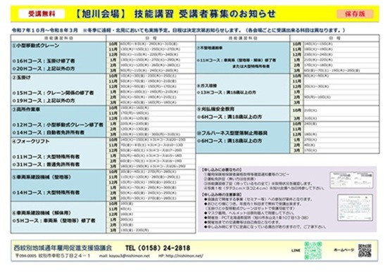 技能講習(旭川出張所開催分)の令和7年10月から令和8年3月までの日程をお知らせいたします。